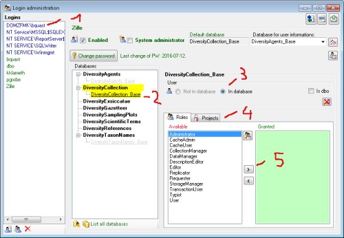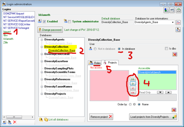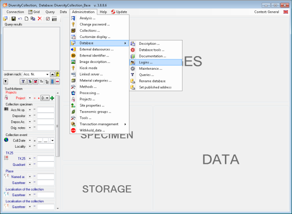 - DiversityCollection öffnen und Administration ⇒ Database ⇒ Logins anwählen: