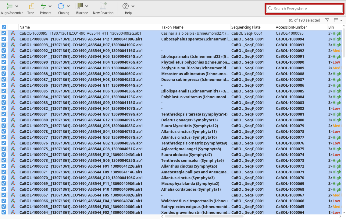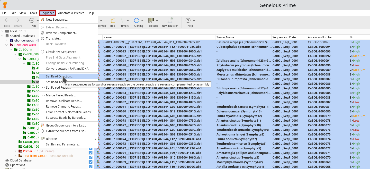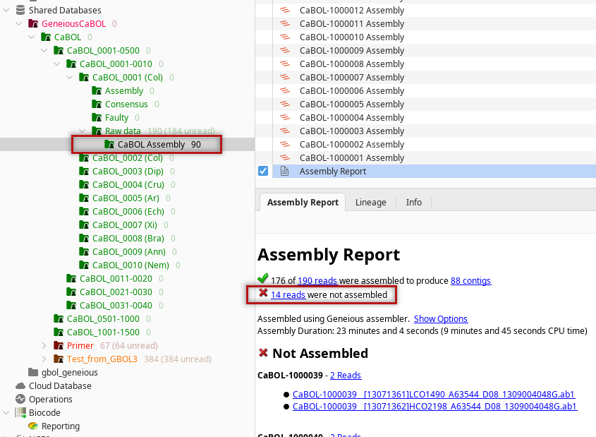 The raw sequences are now assembled (i.e. forward and reverse sequence are superimposed), and the Assemblies are placed in a new sub-folder CaBOL Assembly in the left;