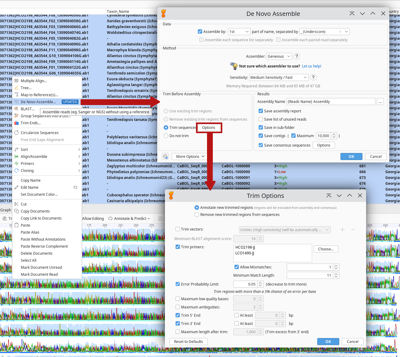 Open the Assembly Report in the CaBOL Assembly folder and click on the Number of not assembled traces (if any): the raw sequences will be selected automatically. Repeat the assembly as before with only the selected sequences, but this time with the Not trim option