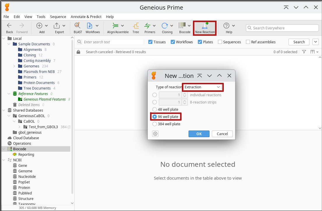 Once you are logged in the Biocode Plugin click on the New Reaction icon in the navigation bar and then select the settings Extraction and 96 well plate in the pop-up window:
