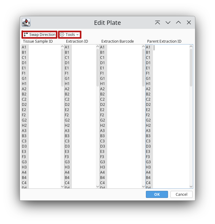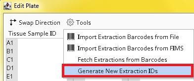 After entering the Tissue Sample IDs select Generate New Extraction Ids via the Tools icon: