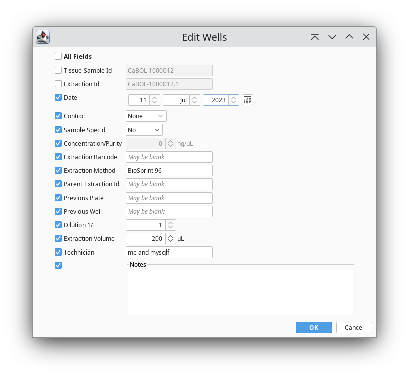 In the column Tissue Sample Id the sample numbers (CaBOL IDs as they are in the DC) can be entered (typed, copied or scanned). Position H12 should contain the negative control