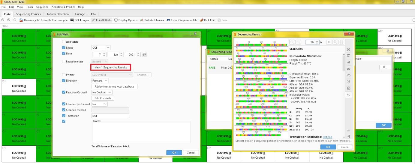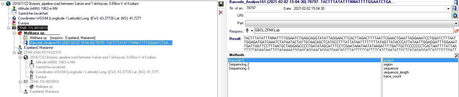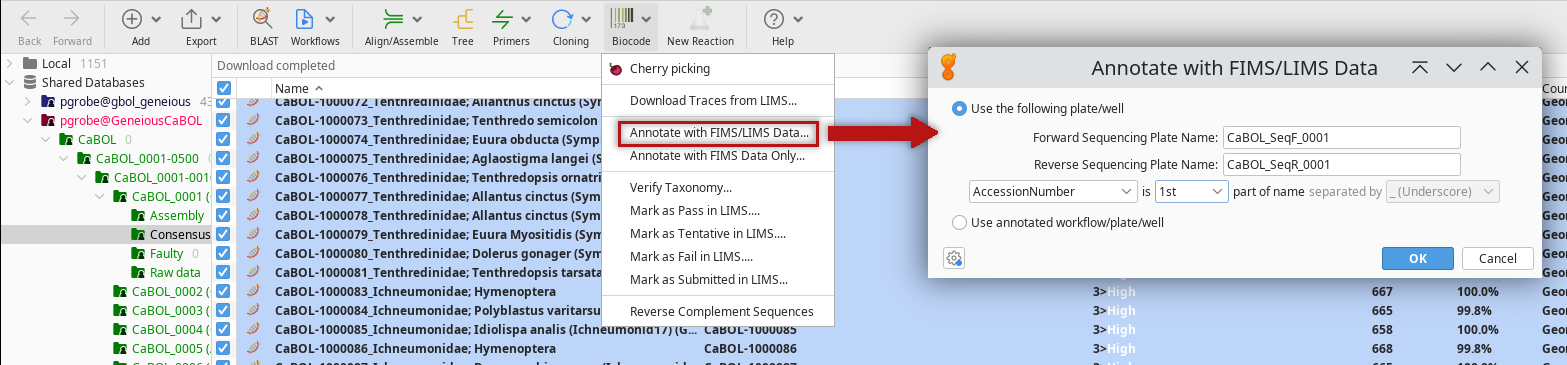 After that, mark all sequences and click on the Biocode button and then on Annotate with FIMS/LIMS Data.