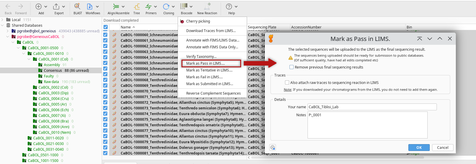 As next - and more or less final- step we pass the Barcodes and all the corresponding lab information back into the DC. For this, mark all consensus sequences which are NOT flagged as “CON/XCON/PCON” and click on the Biocode icon and then on Mark as Pass in LIMS. In the pop-up window insert your name and the name of the plate.