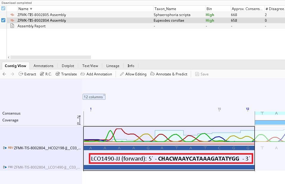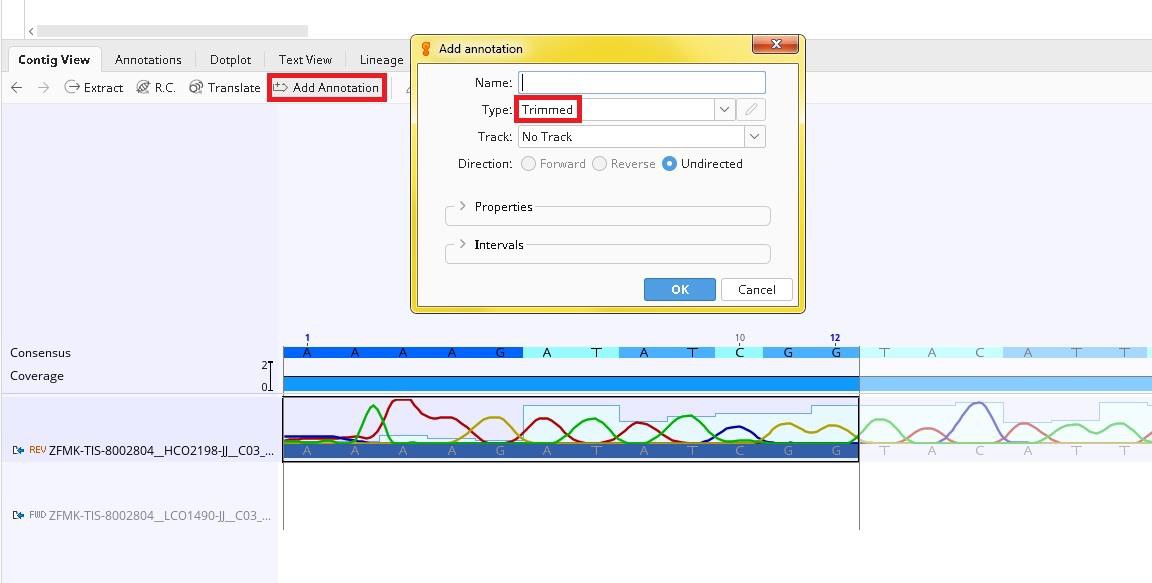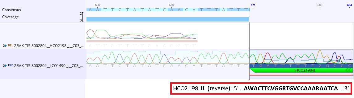 Find and cut the LCO-Primer on the 5´- end of the reverse strand by marking and moving the annotation (pink bar) if not already at the right position.