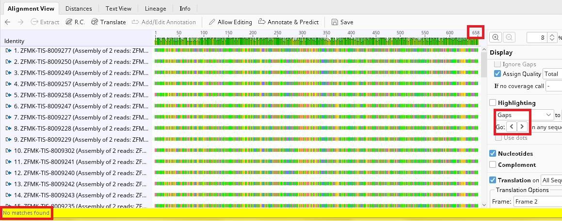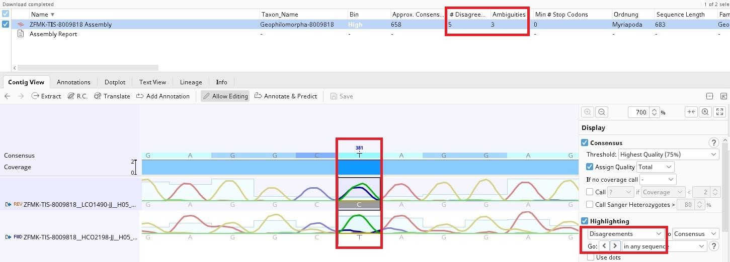 If you have sequences with more than ~6 (1%) ambiguities/ disagreements you should carefully go through all cases and check if they could be edited with a clear conscience (means that the program sometimes makes dubious decision which can be modified to save the barcode ). If you choose disagreements or ambiguities in the drop-down field below Highlighting on the right and then click on one of the arrows then the disagreements/ ambiguities are highlighted one by one.