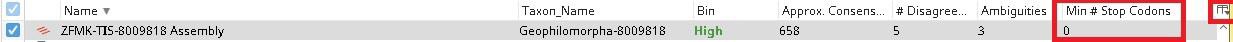 If the Min # Stop Codons or any other parameter is not displayed you can add it via the Manage Column symbol on the right.