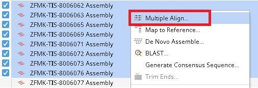 When you checked all assemblies for primers, disagreements/ ambiguities and stop codons, mark them all and right click on Multiple Align.