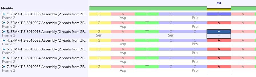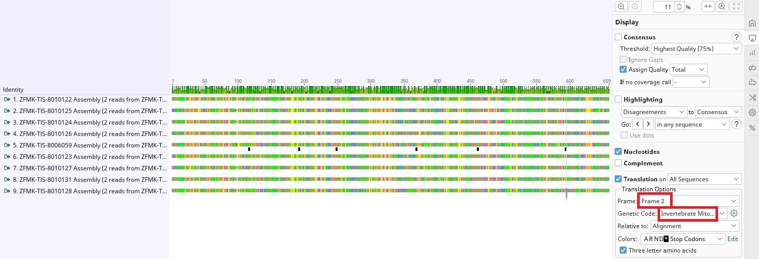 In this example you can see that one sequence is one base too long (659bp) and thus has some stopcodons: