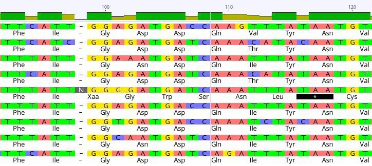 Discard all sequences if they are shorter than 500bp, if they have stop codons, if they produce gaps in an alignment (and you can´t fill it), if they have more than 1% disagreements/ ambiguities and if the binning of Geneious (based on the binning profile which we installed → manage columns: Bin) is still low or medium after creating the consensus sequence (next step).