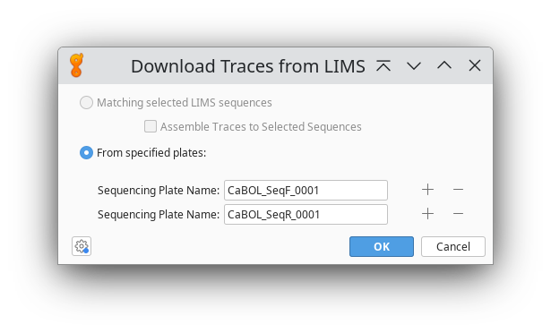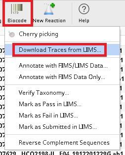 Click on the Biocode icon in the navigation bar of Geneious and then on Download Traces from LIMS.