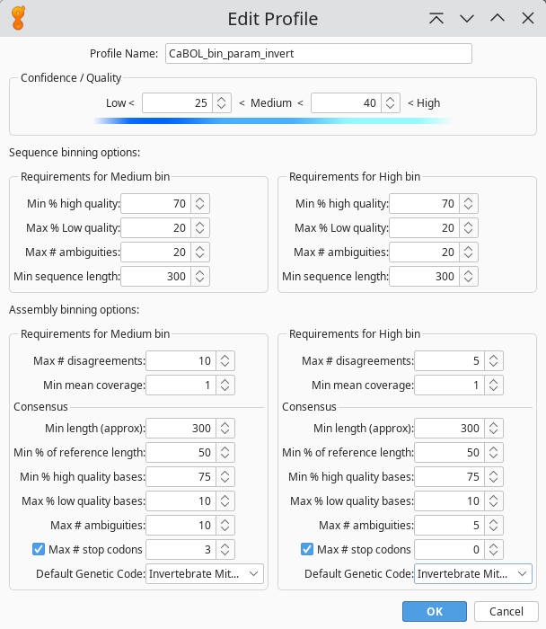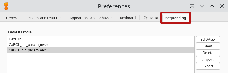 In the Geneious navigation bar, select Tools. Under Sequencing, select the appropriate binning profiles for vertebrates or invertebrates (Nextcloud folder Geneious; https://oc.zfmk.de/index.php/f/831677; files: GBOL_invert.binProfile and CaBOL_vert.binProfile).