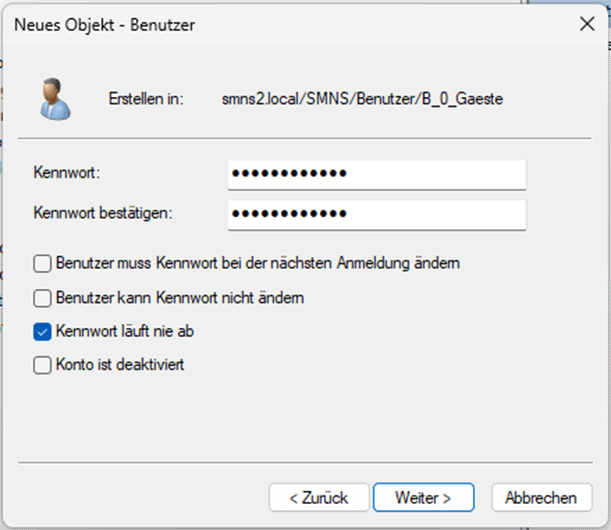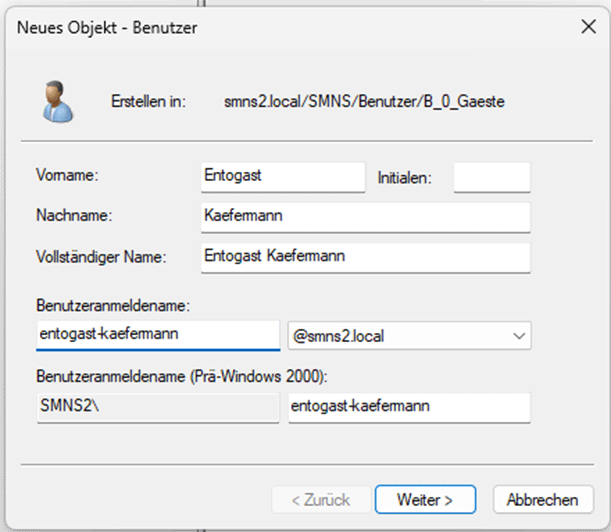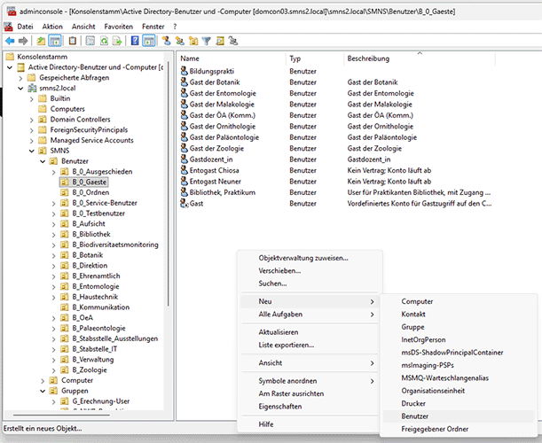 - Auf den Pfad „smns2.local > SMNS > Benutzer > B_0_Gaeste“ gehen, rechte Maustaste > Neu > Benutzer: