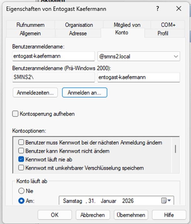 - Die Benutzeraccounts sind smns2.local > SMNS > Benutzer > B_0_Gaeste anzulegen. Der Benutzername soll nach folgendem Schema angelegt werden [abteilungskürzel]gast-[nachname], also z.B. entogast-kaefermann, botgast-klappertopf, palgast-rex, zoogast-loewenfrau, oeffgast-mümmelmann, verwgast-mueller, bdmgast-adenauer, gragast-zoller, htgast-wassermann, itgast-winkler etc. und WICHTIG: Das Ablaufdatum muss auf einen Tag nach dem letzten Arbeitstag des Mitarbeiters festgelegt werden.