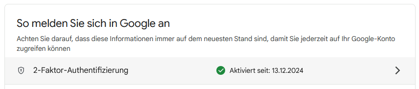 Man muss auf die Accountverwaltungswebsite (nicht die Mailabrufwebseite) der E-Mail-Adresse gehen (https://myaccount.google.com), sich einloggen und dann links unter Sicherheit auf die Sicherheitswebseite gehen. Dort muss man die 2-Faktor-Authentifizierung aktivieren und eine Handynummer angeben, mit der dann der zweite Faktor (SMS mit Einmalcodes) erhalten werden kann. Ist dies erfolgreich geschehen, sollte dann die 2FA als aktiviert auf der Sicherheitsseite angezeigt werden: