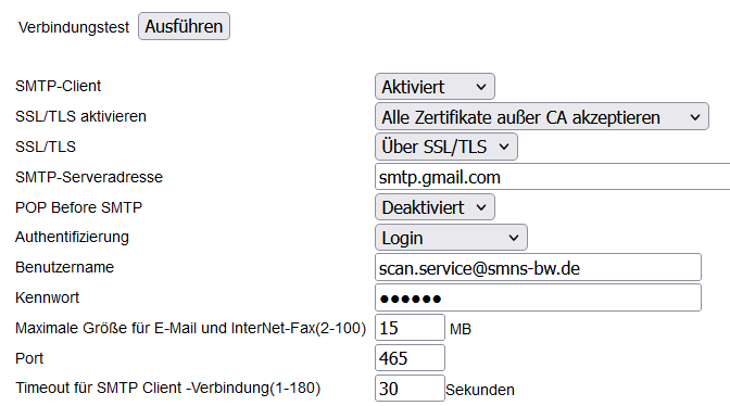 Dabei verbindet sich der jeweilige Drucker via SMTP-Protokoll mit dem Gmail SMTP-Server „smtp.gmail.com“ an Port 465 und authentifiziert sich mit einem sog. „app password“ und der oben genannten E-Mail-Adresse (da diese als Absender fungiert).