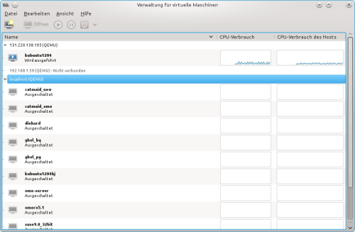 virt-managerforked sich selber vom terminal, so dass dies geschlossen werden kann. Das Programm kann Maschinen auf mehreren Hosts verwalten. virt-manager beendet die Maschinen nicht, wenn es geschlossen wird und nimmt die Verbindung zu laufenden Maschinen wieder auf.