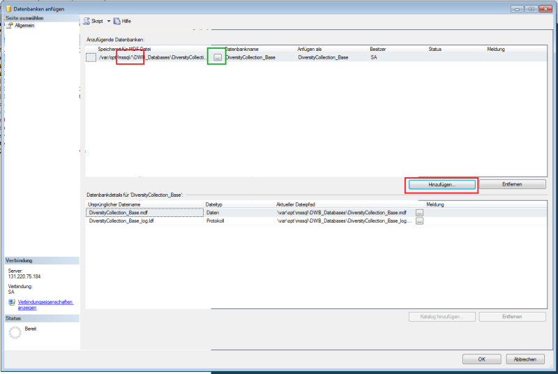 After selecting a new database via the Add button, the path to it is wrong because it contains a backslash. This can be quickly changed by selecting the same file again under Location for MDF file and the … button. Maybe this bug is fixed in the meantime in the newest version.